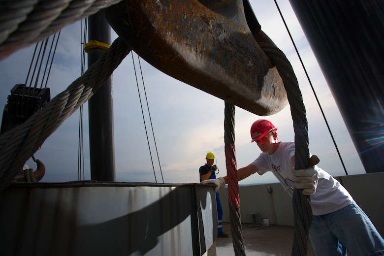 Thema Sicherheit: bei solchen Verhältnissen ist ein professioneller Abseilgurt unerlässlich. Wir besitzen jeder einen eigenen, aber in der Regel kann man auch auf Gurte der Unternehmen zurückgreifen. Rechts sieht man die Sicherheitsleine, die in einer mitlaufenden Mechanik an der Leiter eingehakt ist. Diese Teile gleiten theoretisch immer sauber mit, in der Praxis muss man aber immer mal wieder leicht an ihnen ruckeln, damit man nicht hängen bleibt. Arbeitet man mit so einem System, kann man sichergehen, dass einem nichts passiert.