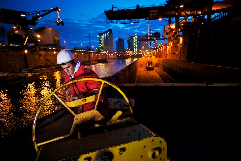 Besondere Würze verleihen die „kleinen Abenteuer“ zwischendurch. Um die aufregendere Perspektive zu bekommen oder unerwünschte Elemente aus dem Bild zu verbannen, ist es oft nötig, auf Kräne zu klettern, in Rohre zu kriechen, in Auffangbehälter hinabzusteigen oder ähnliches mehr. Das erfordert körperliche Fitness und taktiles Geschick, zumal wir ja auch noch eine schwere Kamera und leistungsfähiges Blitzlicht mit uns führen wollen.