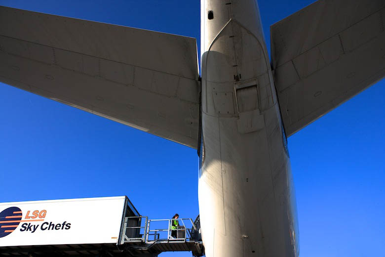 Also hat der Gabelstapelfahrer mich mit großem Vergnügen auf eine Palette geparkt, diese mit dem Stapler verschraubt und mich dann in die Höhe gehoben. Als Sicherung genügte hier ein Hüftgurt und eine kurze Leine mit Karabinerhaken. Positiver Nebeneffekt: ich konnte aus der Höhe auch noch ein interessantes Foto der Montagehalle machen, das ich vorher nicht hatte.